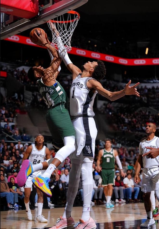 要說(shuō)身體天賦,字母哥絕對(duì)是當(dāng)今聯(lián)盟的天花板,同樣是內(nèi)線球員,字母哥沖擊力十足,同時(shí)還是個(gè)魔鬼筋肉人。大部分時(shí)間,字母哥只要沖起來(lái),對(duì)手就只能犯規(guī)才能阻止他了。不過(guò)文班亞馬的護(hù)框,依舊可以限制字母哥。看看兩人的對(duì)位圖片,字母哥飛在空中,而文班只是站著就可以覆蓋籃下整個(gè)區(qū)域,太無(wú)解了。