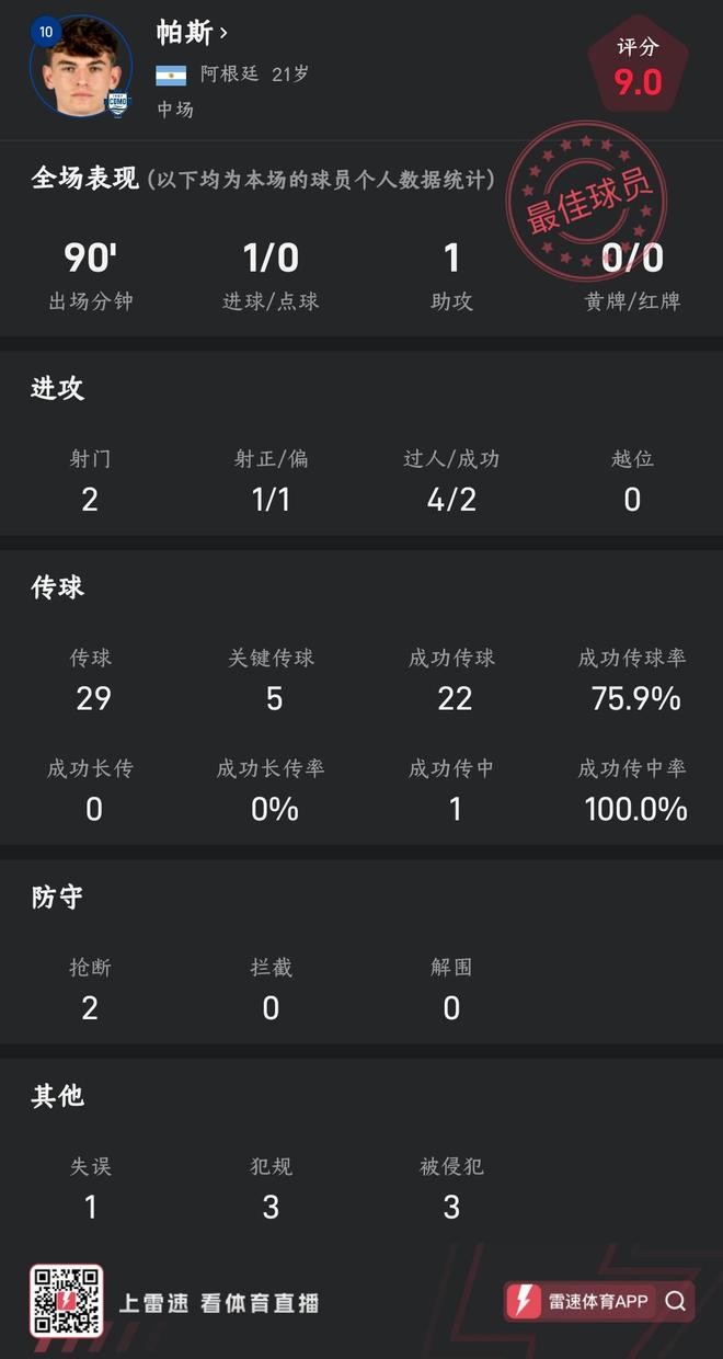 但在臨場(chǎng)對(duì)決中,阿根廷新星帕斯的表現(xiàn)完全碾壓土耳其新星伊爾迪茲。帕斯此役踢滿90分鐘貢獻(xiàn)1射1傳。帕斯全場(chǎng)2次射門1次射正攻入1球,4次嘗試過人其中2次過人成功。傳球方面,帕斯全場(chǎng)完成29次傳球,22次傳球成功(含5次關(guān)鍵傳球、1次助攻),傳球成功率達(dá)到75.9%。此外,帕斯此役2次搶斷、3次被侵犯,另有1次失誤及3次犯規(guī)。