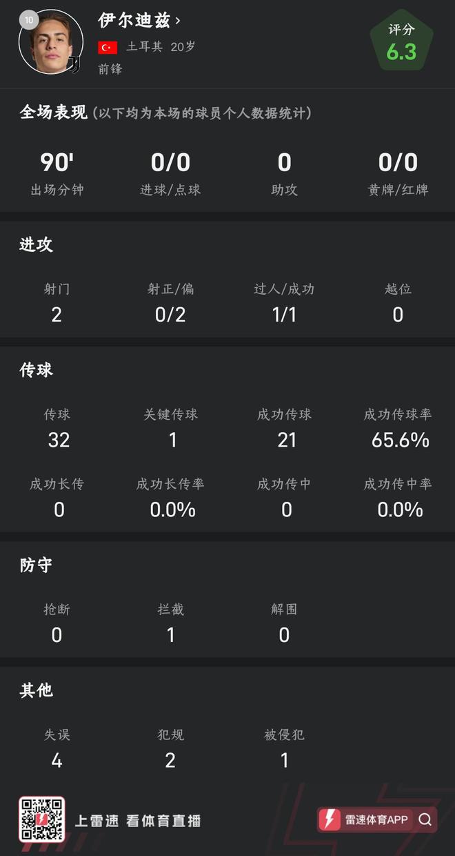 伊爾迪茲同樣踢滿90分鐘,全場(chǎng)2次射門全部射偏。1次嘗試過人且成功。傳球方面,伊爾迪茲全場(chǎng)32次傳球,其中21次傳球成功(含1次關(guān)鍵傳球),傳球成功率65.6%。防守端,伊爾迪茲全場(chǎng)僅完成1次攔截。此外,伊爾迪茲全場(chǎng)4次失誤、2次犯規(guī)且1次被侵犯。